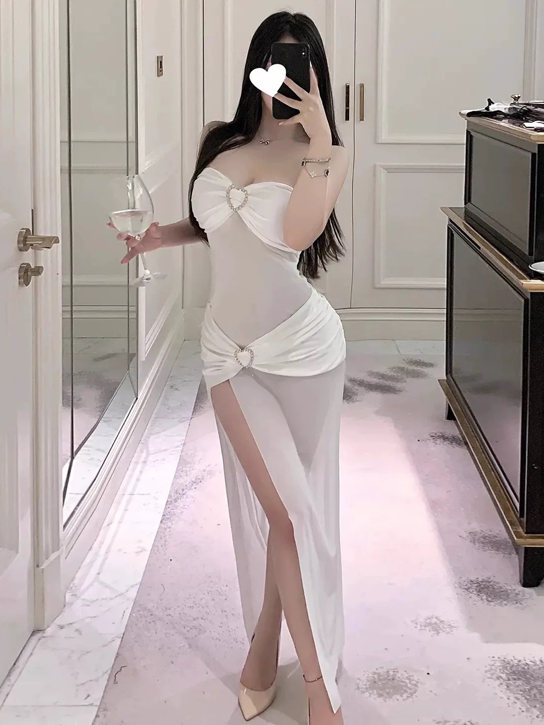 Chi tiết khoen tim được đặt ở vị trí nổi bật, như một điểm sáng giữa màn vải trong suốt. Nhỏ nhưng sắc nét, giúp set đồ vừa ngọt ngào vừa táo bạo.