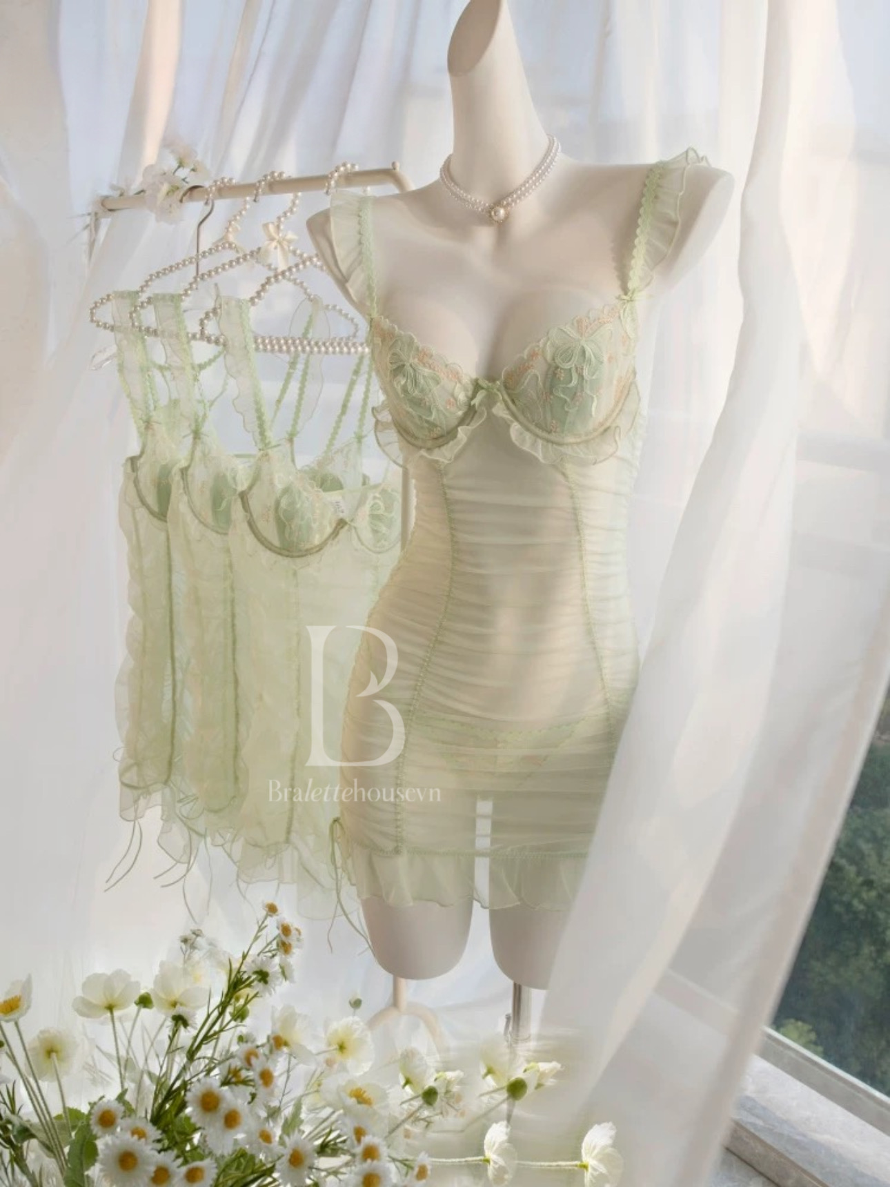 [Kèm quần] Đầm váy ngủ nữ cao cấp Mint Dress S2517 – Xuyên thấu phối ren, cánh tiên ôm dáng – Bralettehousevn