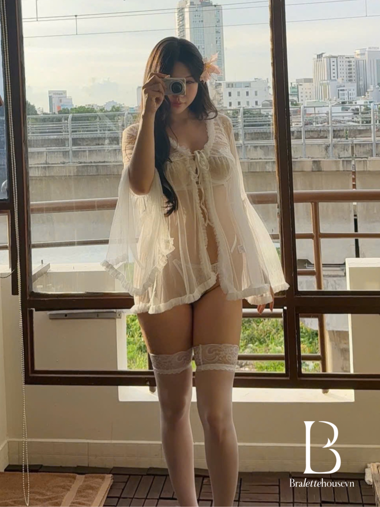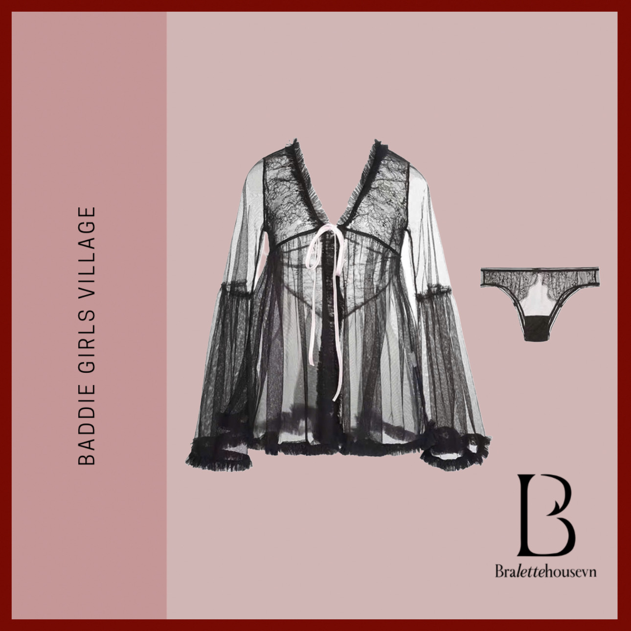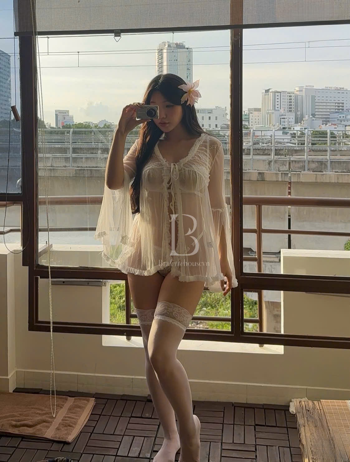 💫 Áo choàng xuyên thấu phối ren cao cấp, tay xoè nhẹ nhàng phối nơ điệu đà – vừa kín vừa hờ hững, khiến ai nhìn cũng phải “rối trí”.