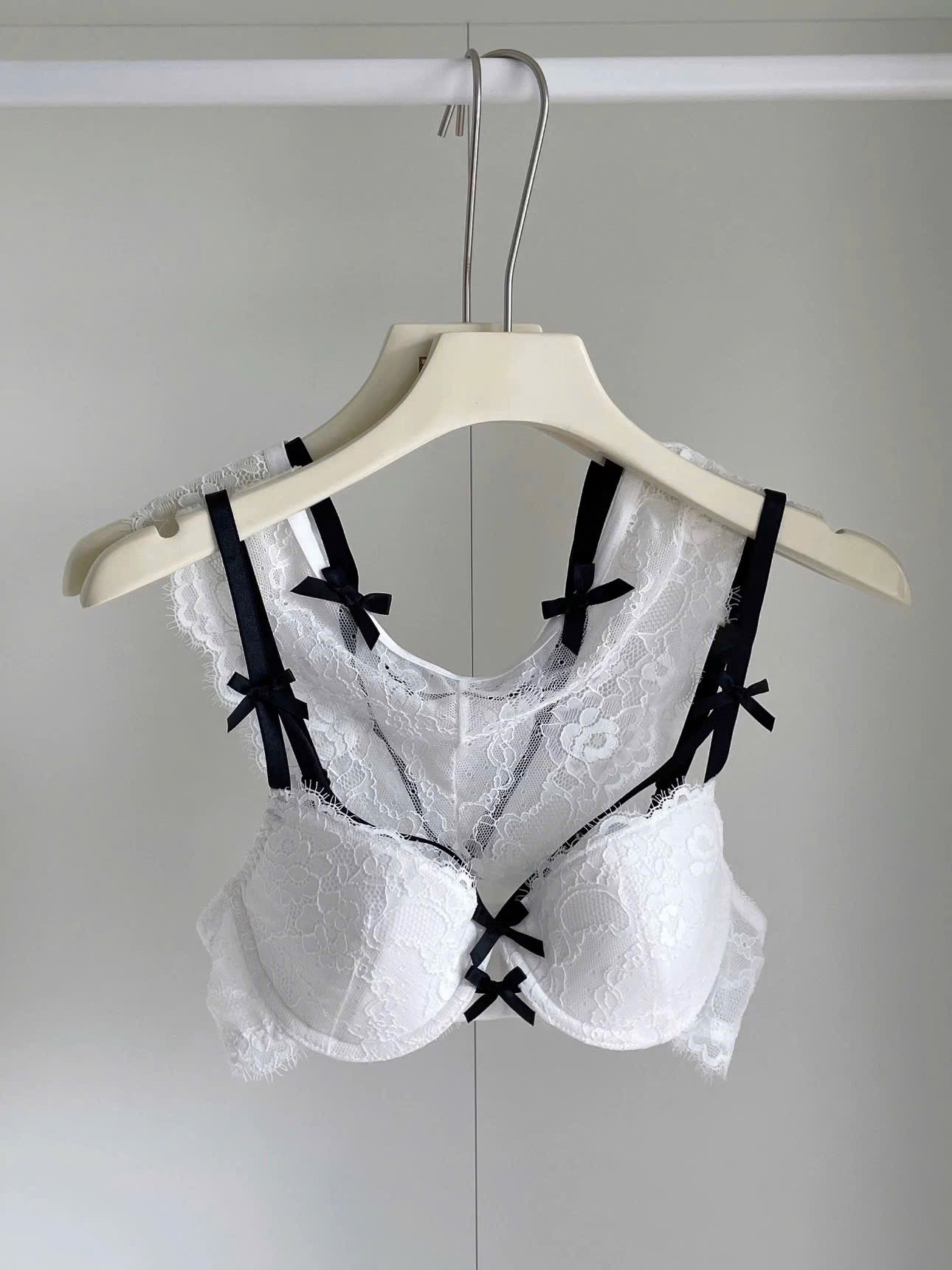 Chất liệu ren mềm mại ôm nhẹ làn da, với họa tiết tinh xảo mang hơi thở cổ điển, vừa thanh lịch vừa gợi cảm. Phần quần đi kèm được thiết kế đồng điệu, tôn dáng và tạo nên tổng thể hài hòa, khiến từng chuyển động đều trở nên uyển chuyển, duyên dáng.