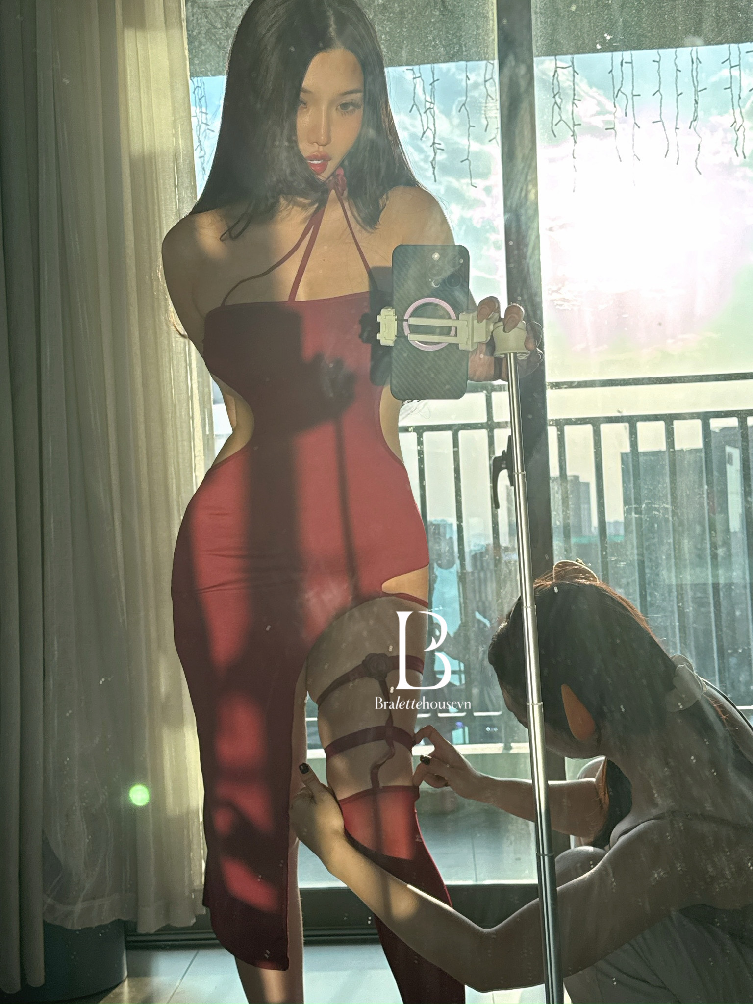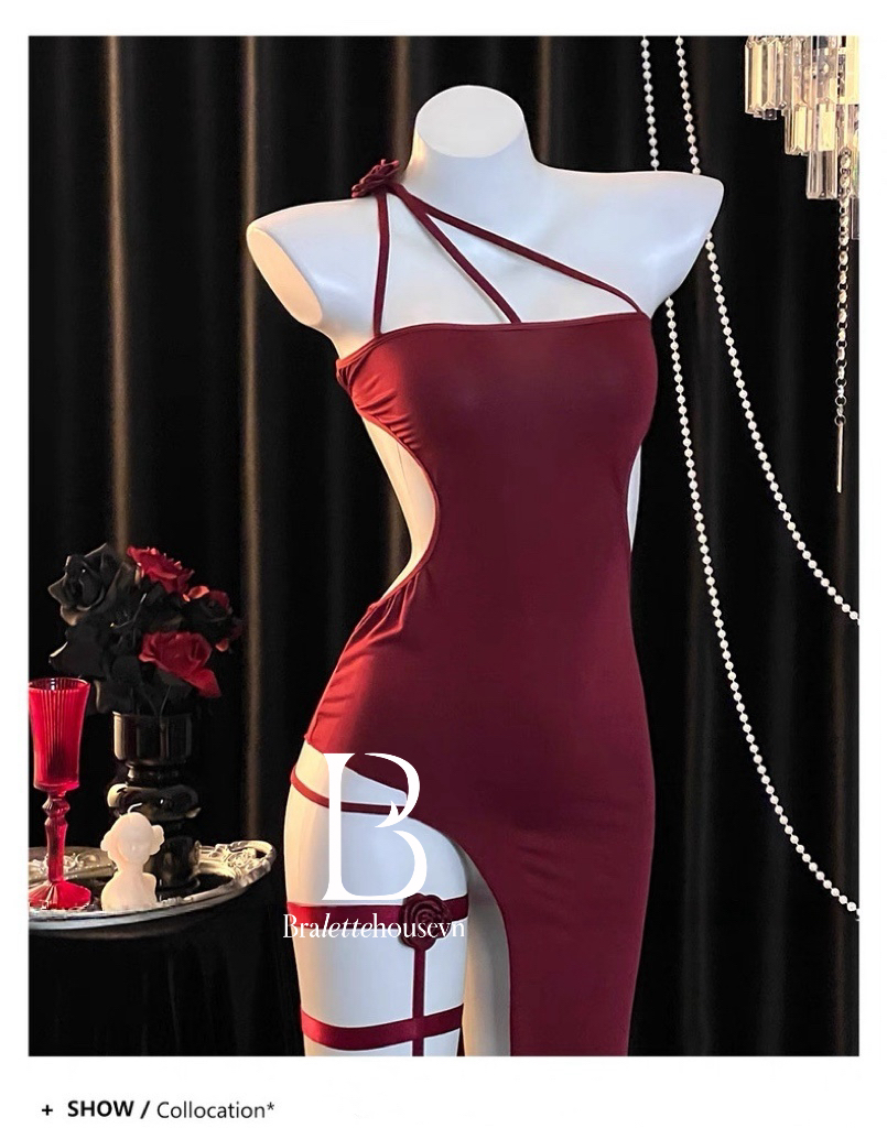 Điểm nhấn đặc biệt là đôi tất hoa hồng đi kèm — vừa nữ tính, vừa gợi cảm, tạo nên tổng thể hài hòa giữa sự ngọt ngào và nét quyến rũ đầy tinh tế. Từng chi tiết nhỏ đều góp phần làm nổi bật thần thái quyến rũ rất riêng của bạn.