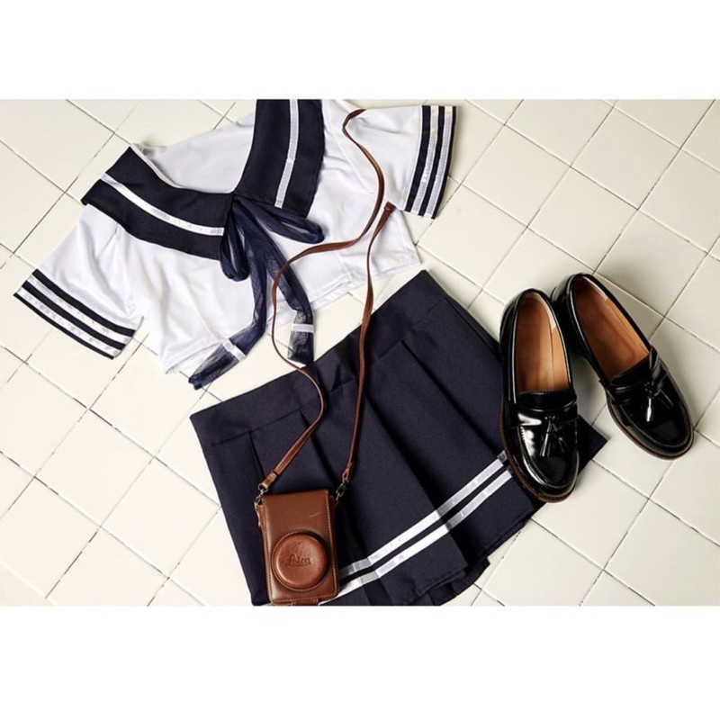 Set gồm áo có khăn cổ, váy với đai dán, quần lọt khe và tất.