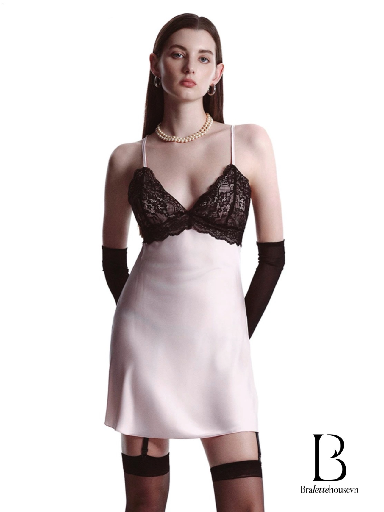 Chất vải satin cao cấp với độ bóng nhẹ nhàng tạo nên vẻ ngoài lấp lánh, kết hợp cùng họa tiết ren ở phần cổ và chân váy, làm tăng thêm sự cuốn hút đầy bí ẩn. Kiểu dáng tiểu thư, thanh thoát nhưng cũng đầy gợi cảm, hoàn hảo cho những cô nàng yêu thích sự tinh tế và quyến rũ.