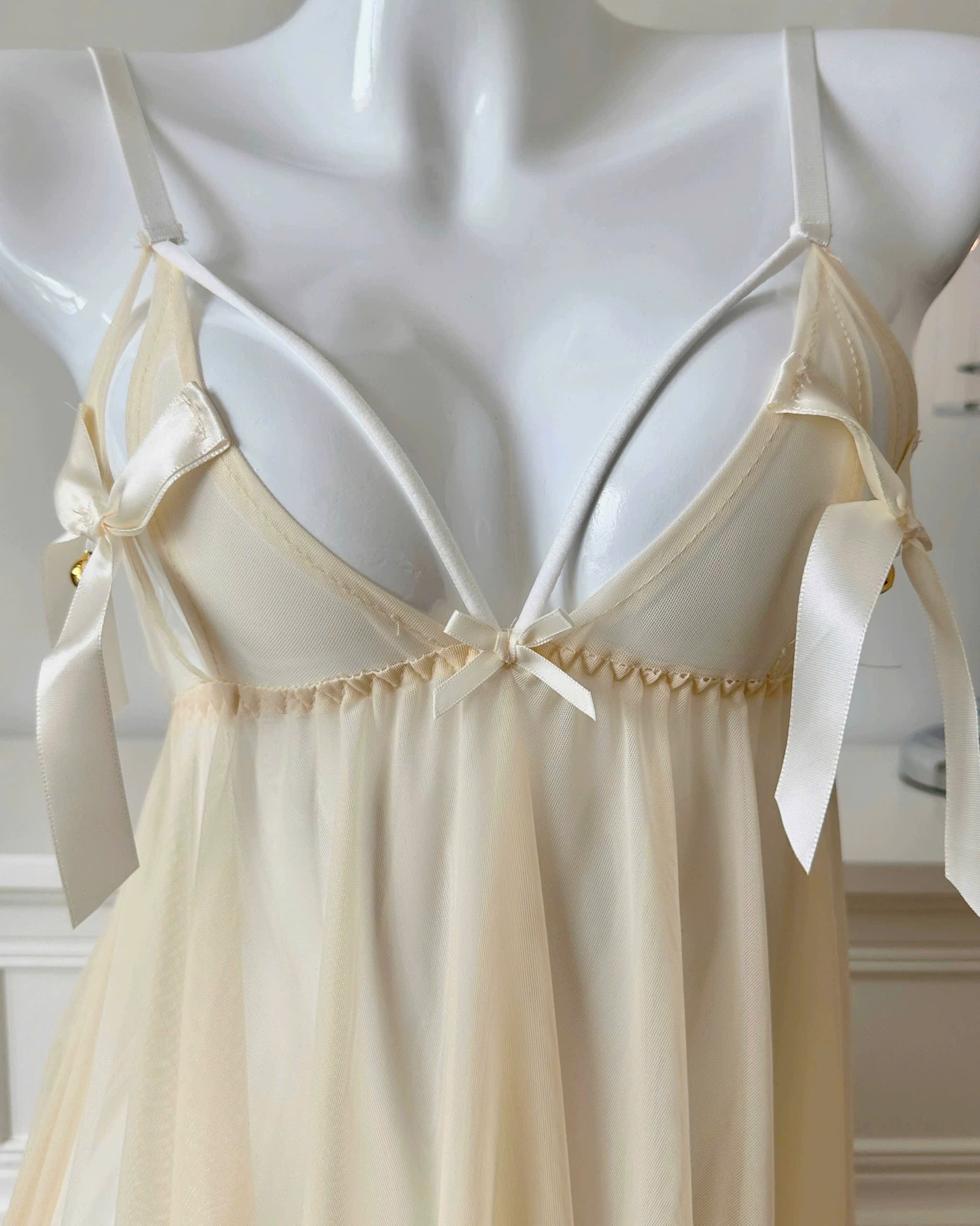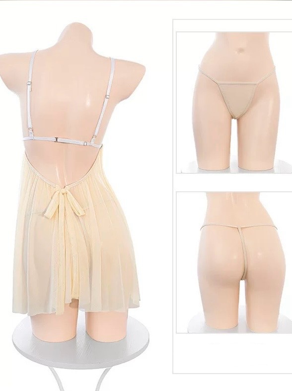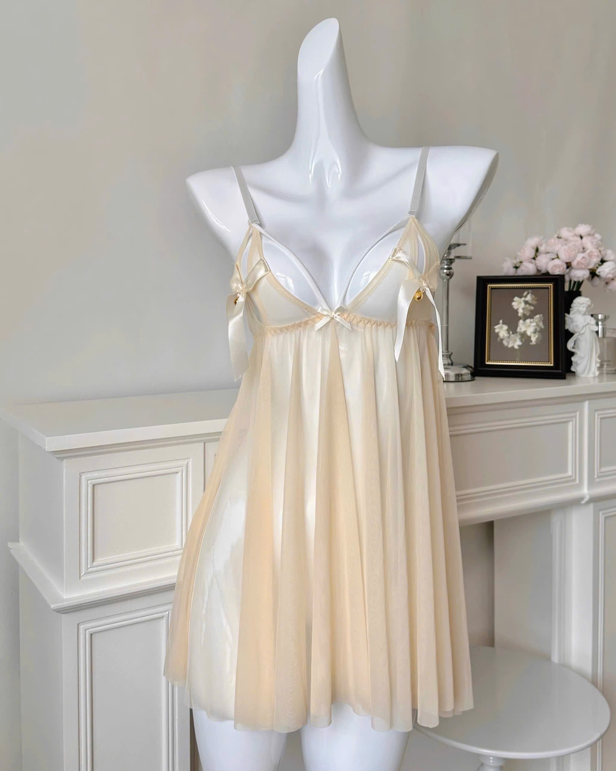 Váy ngủ voan xuyên thấu – xẻ tà sau quyến rũ – đính nơ chuông nhỏ xinh phía trước