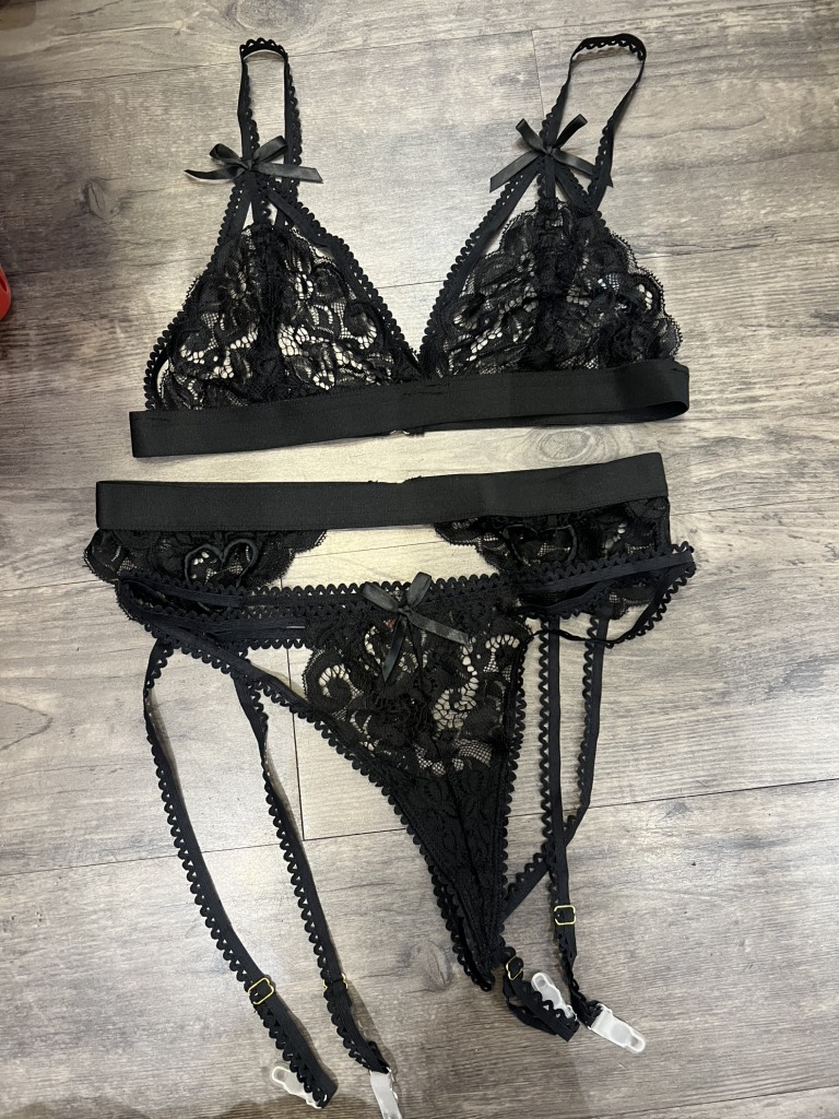 Điểm nhấn đặc biệt từ chi tiết trái tim cách điệu – vừa tinh nghịch, vừa gợi cảm – khiến tổng thể trở nên độc đáo và khó quên. Set gồm áo, quần và vớ ren đồng bộ, mang lại trải nghiệm đầy đủ, chỉn chu cho từng khoảnh khắc riêng tư.